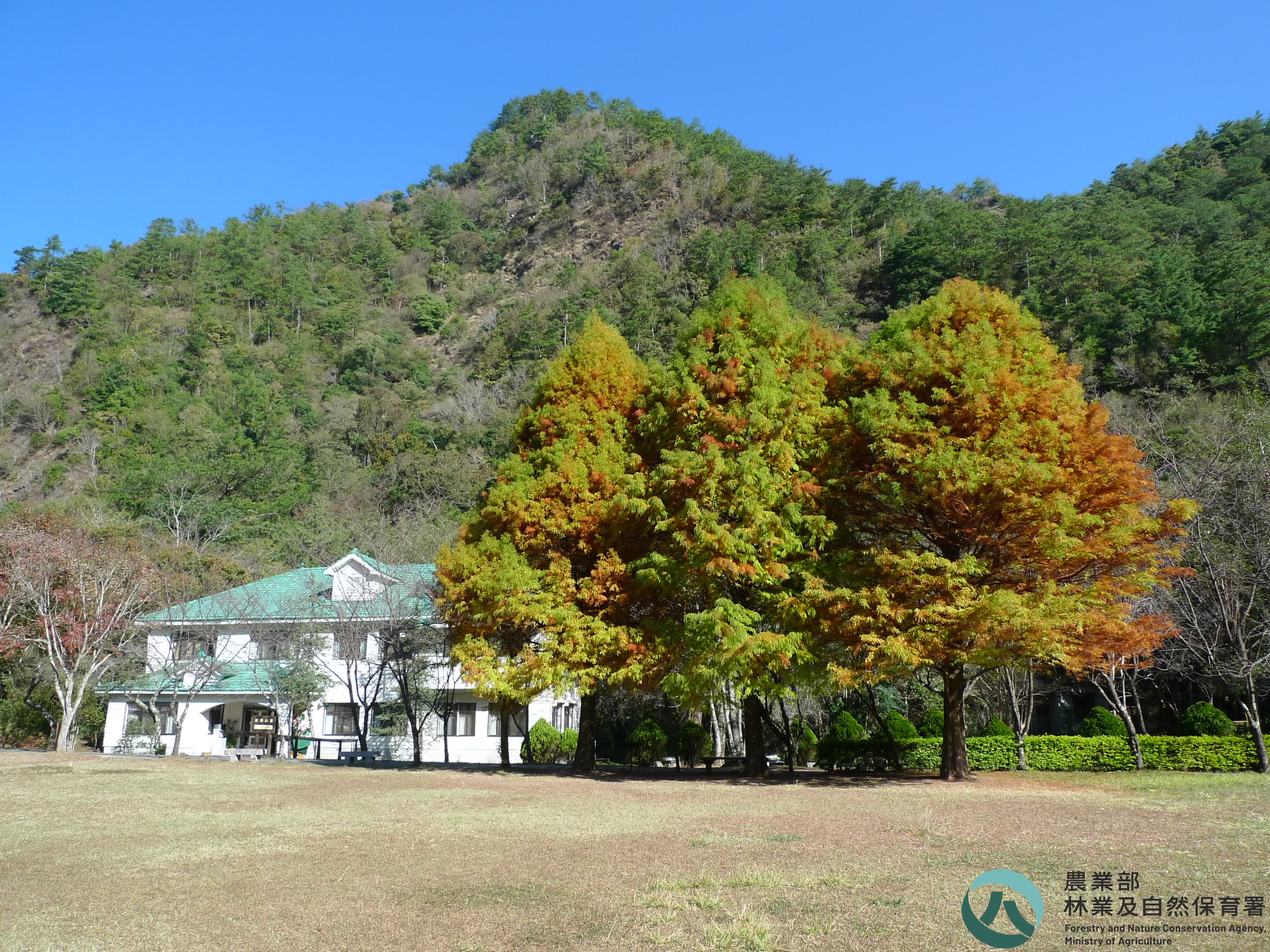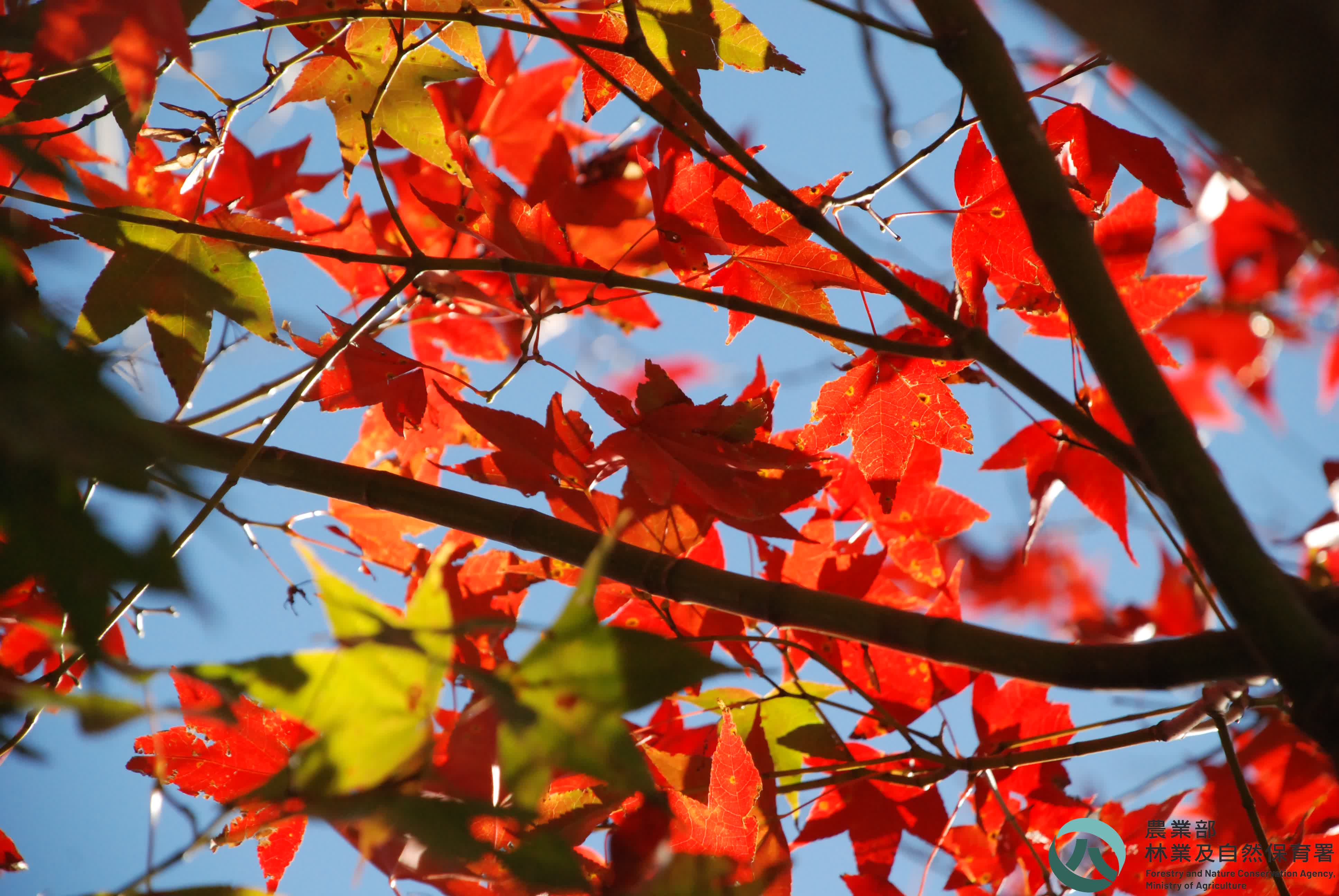 照片摘要 奧萬大國家森林遊樂區內各種植物呈現紅黃橘綠,加上天空的湛藍,形成五彩繽紛的美麗夢幻。